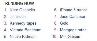 And here to your left are the topics that Yahoo says are “trending now”. Seems that Yahoo only tracks people who care about actors, athletes and politicians.