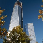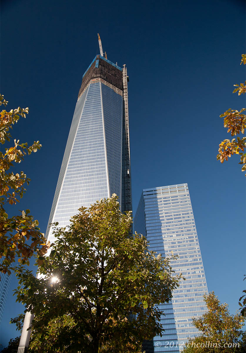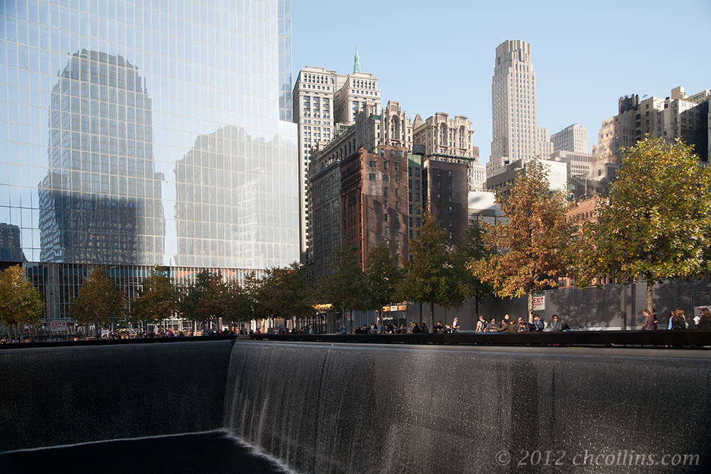 After passing several security checkpoints and an airport scanner (had to remove my hat and belt but not my shoes), we eventually arrived at the plaza area of the memorial. Looking up, you see WTC 1 on the left, WTC 7 just behind it on the right.