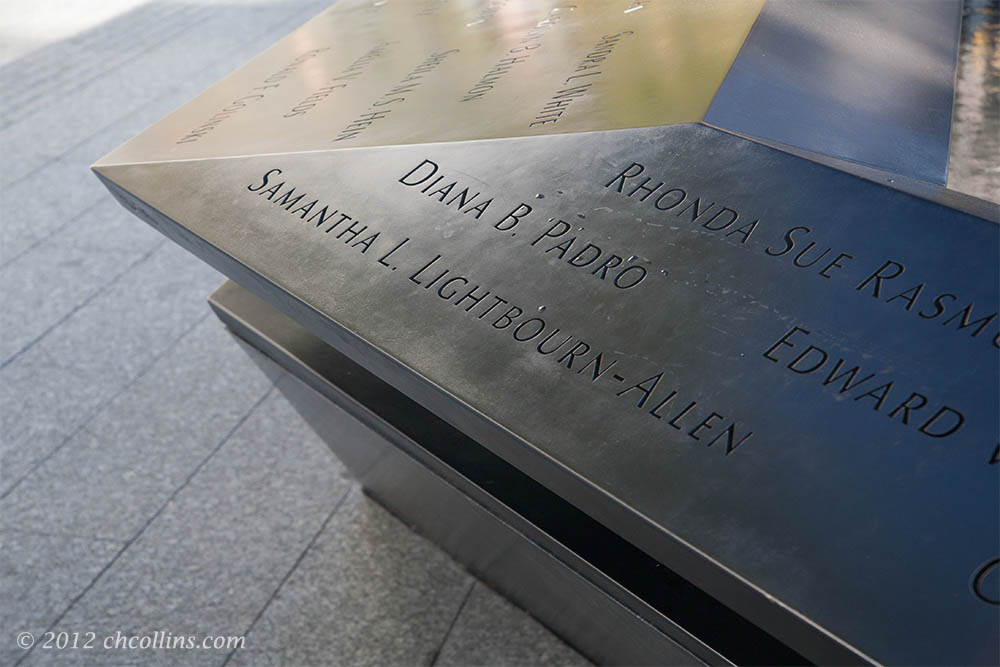 The names of those who died in the attacks are inscribed on top of 42-inch-high parapets surrounding each pool. This corner of the south pool lists those who died at the attack on the Pentagon.