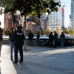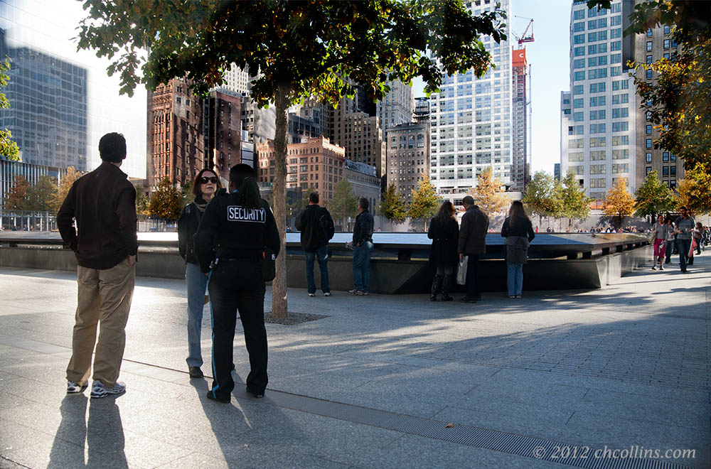The plaza has a more subdued security presence, but officers are easy to spot if you need one. The prominent features of the plaza are the museum (still under construction) and the pools where the twin towers stood. For this photo I faced the south pool, with the museum (not visible) to my left and the north pool to my back. ….. ….. ….. ….. ….. ….. ….. ….. …..