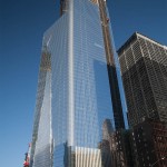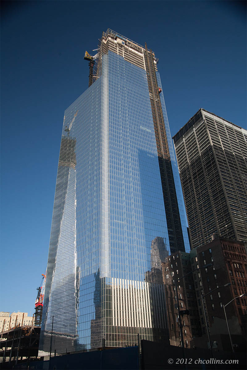 Along Greenwich Street, the image of WTC 1 is reflected in the west side of WTC 4.