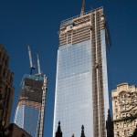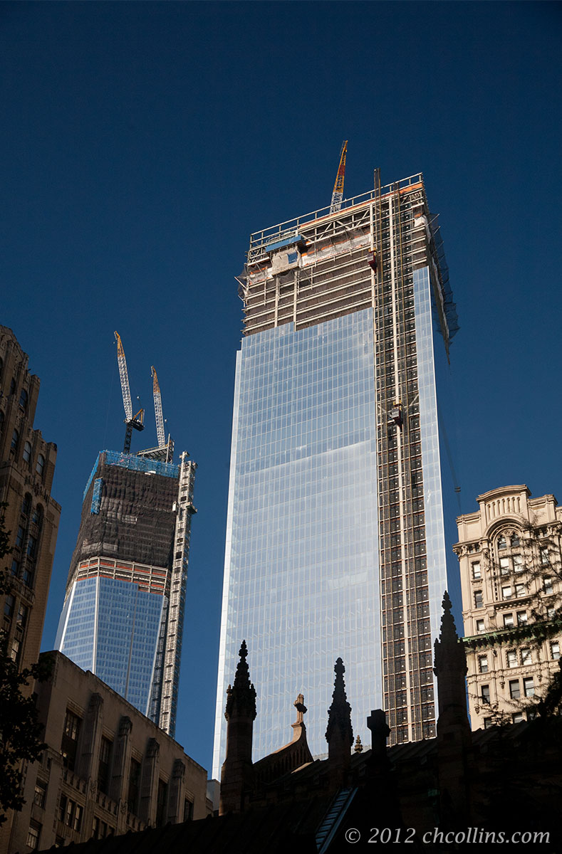 The view from Rector Street, as you walk from Wall Street to the visitor entrance at Greenwich and Albany Streets. The spires of Trinity Church are seen in the foreground. WTC 1 (on the left) and WTC 4 are the tallest towers currently under construction.