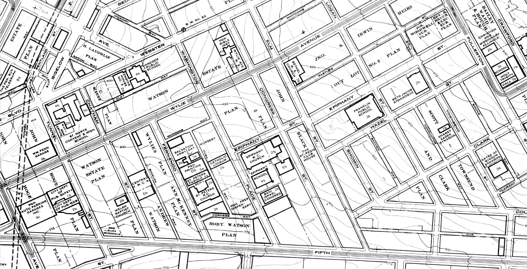 1930s Street Grid, Lower Hill, Pittsburgh, PA• The City of Pittsburgh is planning to redevelop the site where its Civic Arena once stood, the venue where I saw The Doors (once) and Chicago (twice) from up in the crow’s-nest section.  The plan calls for restoring part of the Lower Hill street grid.  If and when they do, I hope they bring back Epiphany Street.  Who wouldn’t want to live on Epiphany Street?  It would be…  what’s the word I’m looking for?