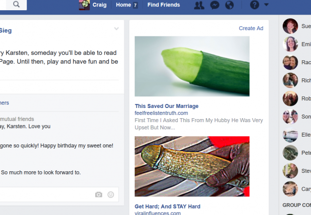 • Advertising on Facebook is one thing, but this is getting out of hand. The other day when I signed on, I was confronted with the bizarre ads you see in the screenshot at right. I can’t imagine what I would have said on Facebook that caused it to show me such ads. Trump is a dick? (Never said that, at least not there.) And just today, another Facebook ad suggested that Regis Philbin died. What did I ever say about Regis?