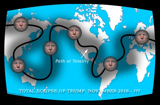 The Total Eclipse of Trump started in November 2016. Astronomers cannot predict when it will end. Its path of totality over the face of the Earth is shown in the illustration below:
