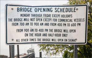 After doing some research, I discovered that the bridge schedule has been changed multiple times in the past decade, in response to traffic backups in the Beaufort historic district. So, the sign in the photo may have already been replaced. In light of the fluid (haha) situation, I offer this: list the times when the bridge always opens on signal, otherwise tell boaters where to find the current schedule.