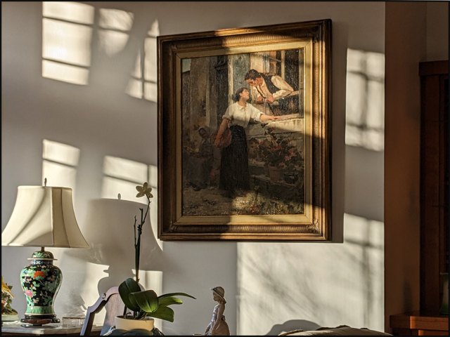 Beautiful! And the light streaming through your window panes perfectly highlights the window in the painting. It’s almost like you planned the photo that way! ;~)