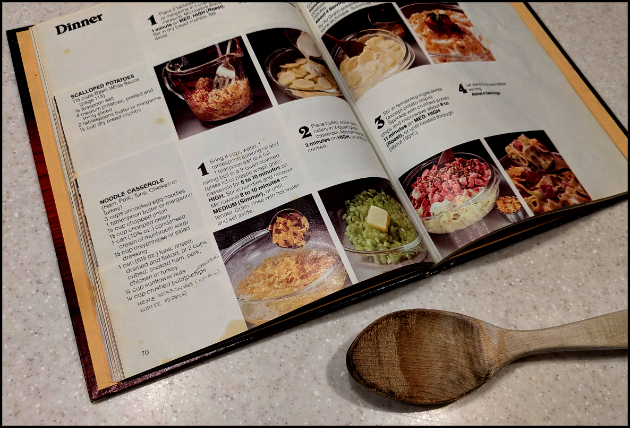 My tuna noodle recipe came from Microwave Cookbook from Litton (1981), the kind of recipe book that accompanied every microwave oven ever made, back in the days when microwave oven manufacturers marketed their product to us as a time-saving replacement for conventional ovens — when all we ever asked them to do was reheat yesterday’s coffee.