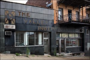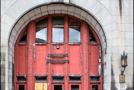 I was able to capture the entire building from across the street, using my 16mm lens. Even then, I had to use Photoshop to produce this front-on perspective. While I was at it, I decided to render the bank as it might have appeared on a 1920s postcard. I added an optimistic blue sky and replaced nearby buildings and parking lots with trees. I spent the most time erasing telephone and power lines that crossed in front of the building — as a result, this is probably the only “clean” image of the bank you will find on the internet. (I did not remove the plywood panels over the windows.)